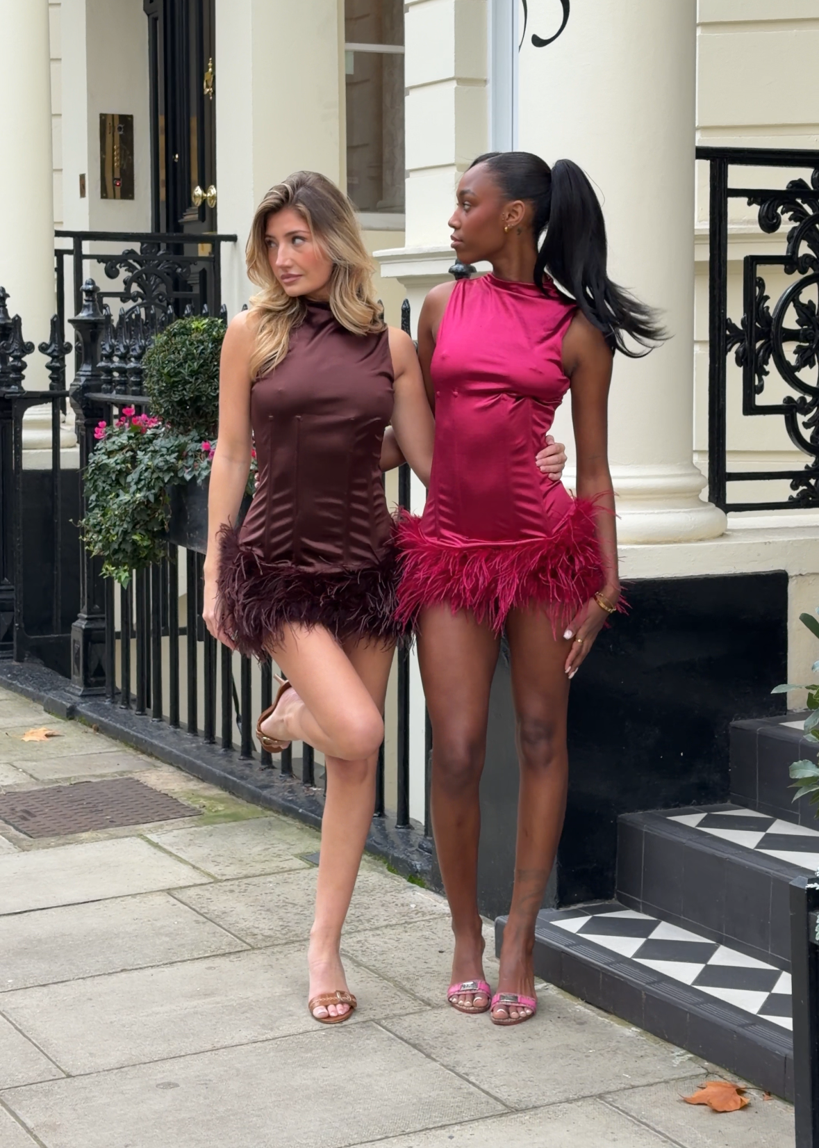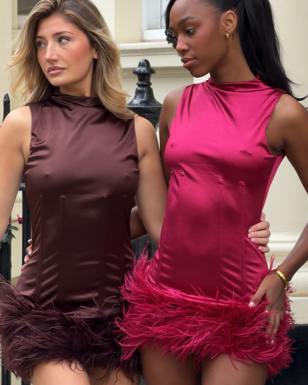 Fabric: Our Sophia dresses are created using recycled Vita Nylon. It is versatile, breathable and soft. The trim is ethically sourced genuine ostrich feather.