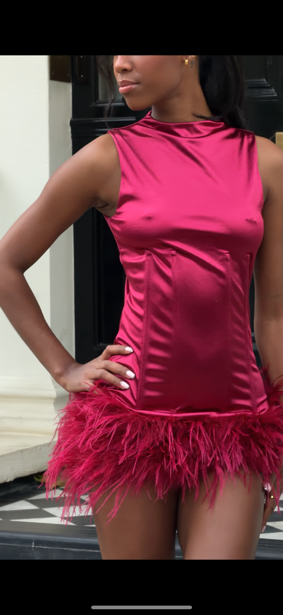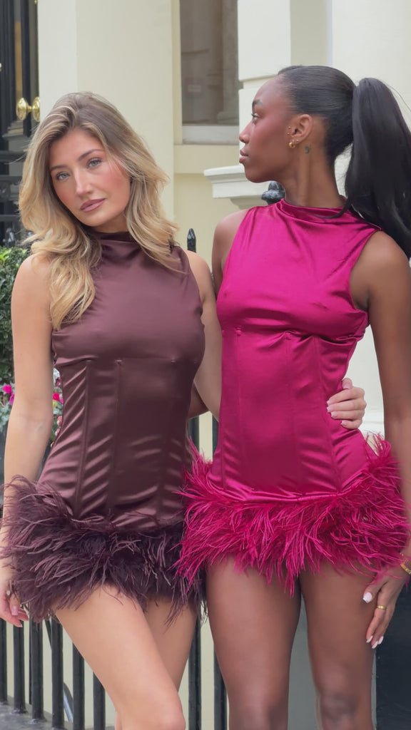 Fabric: Our Sophia dresses are created using recycled Vita Nylon. It is versatile, breathable and soft. The trim is ethically sourced genuine ostrich feather.